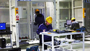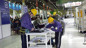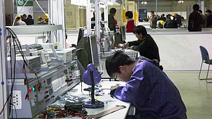 场外是老师领导们热切关注的眼神,场内是紧张忙碌的场面。电气部的选手们发挥出良好的心里素质,从容冷静,全情投入到手头的操作中去,专注、有条不紊地按平时训练的流程娴熟地一步步往下进行着。两位选手间的配合非常默契,分工合作,各自忙着自己手头的任务,同时又不时交流一下,商量一些要点。做得快的选手又抓紧时间去给自己的同伴帮忙。两人既明确分工,但又和谐统一。共同的任务把他们紧紧地凝聚在一起,团结互助。“机电一体化设备安装调试”项目耗时较长,历时4个小时,“电气安装与维修”历时2个小时,“电子产品装配与调试”历时2个半小时。整个赛事中选手们始终专注于自己的任务中,无暇旁顾。场外观看的指导教师和领导们的心也始终被场内的赛事紧紧牵动着,一直等候在赛场边密切关注着选手们的比赛。