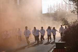 随着梁桦书记宣布演习开始的一声令下,演练模拟警报随即拉响,疏散演习拉开了帷幕。烟雾弹产生的滚滚浓烟在学校多处教学楼及学生宿舍区内冒出,分布在学校教学楼、宿舍楼内的演习学生在班主任老师及演习工作人员的指导下,用纸巾捂住鼻子,按照既定的疏散线路,安全、迅速、有序地疏散到安全地带。