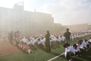 整个过程,参加演练的学生从本班教室撤离到操场安全区域,前后只用了不到2分钟时间。安全撤离后,参演同学双手抱头,两脚蹲地。随后,工作人员认真清点了人数,并向现场总指挥汇报。