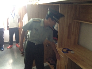 此次宿舍安全检查由陆浩勤副校长担任总负责,叶正介主任为总协调。在安保处、学生处的牵头指挥及教学部的配合支持下,共分为6个工作小组,分赴各幢宿舍楼开展以违禁物品、危险化学品、电吹风、电热快等为重点的检查。同时,安全检查的内容还涉及消防安全,包括安全疏散指示标志、应急照明是否完好;消防设施、器材和消防安全标志是否在位、完整等。