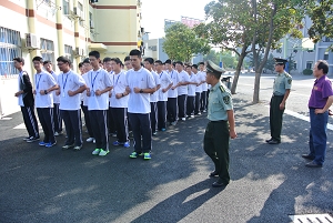 早上8点,陆续有班级在驻校教官的指挥下练习集队进退场,熟悉进场以及退场顺序,为开学第一次升旗仪式做充足的准备。