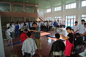 同时,学校七个教学部在各自班级开展了不同形式的自查。对于存在问题的学生,在驻校教官的统一安排下,来到学校舞蹈房,由聘请的理发师当场整改。