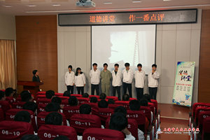 阶梯教室的学校道德讲堂里,50多名学生被姚维兰老师深深吸引着。这堂课的教学设计里既完成遵照《嘉定区道德讲堂实施办法》的活动形式要求,由“唱一首歌曲”、“看一段短片”、“诵一段经典”、“讲一个故事”、“做一番点评”构成,又让每个环节都耳目一新,在形式上冲击力十足,内容感染力了得: